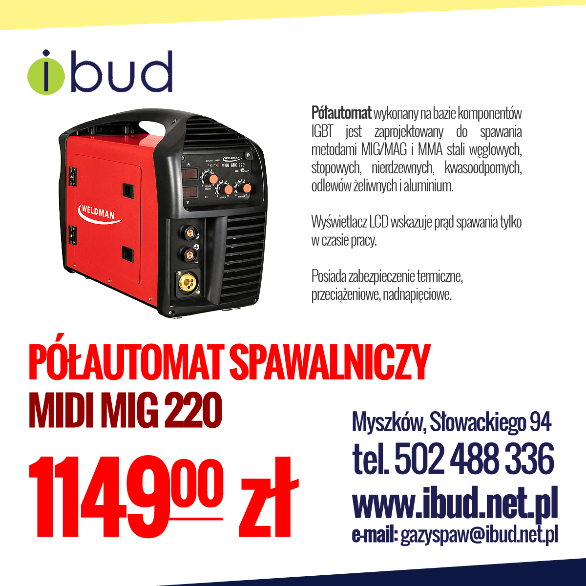 Półautomat spawalniczy zasilany jednofazowo MIDI MIG 220 wykonany w technologii inwertorowej IGBT do spawania metodą MIG/MAG (w osłonie gazu) lub FLUX (bez osłony gazu) oraz do spawania elektrodami otulonymi prądem stałym (DC).
